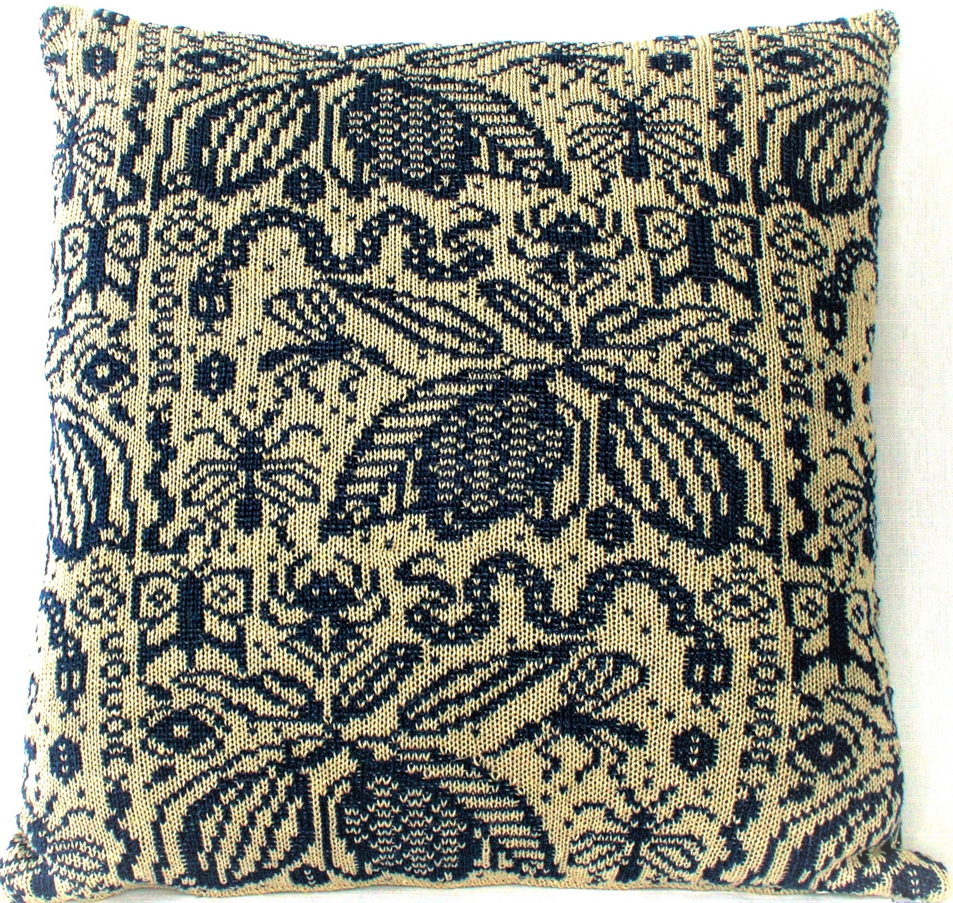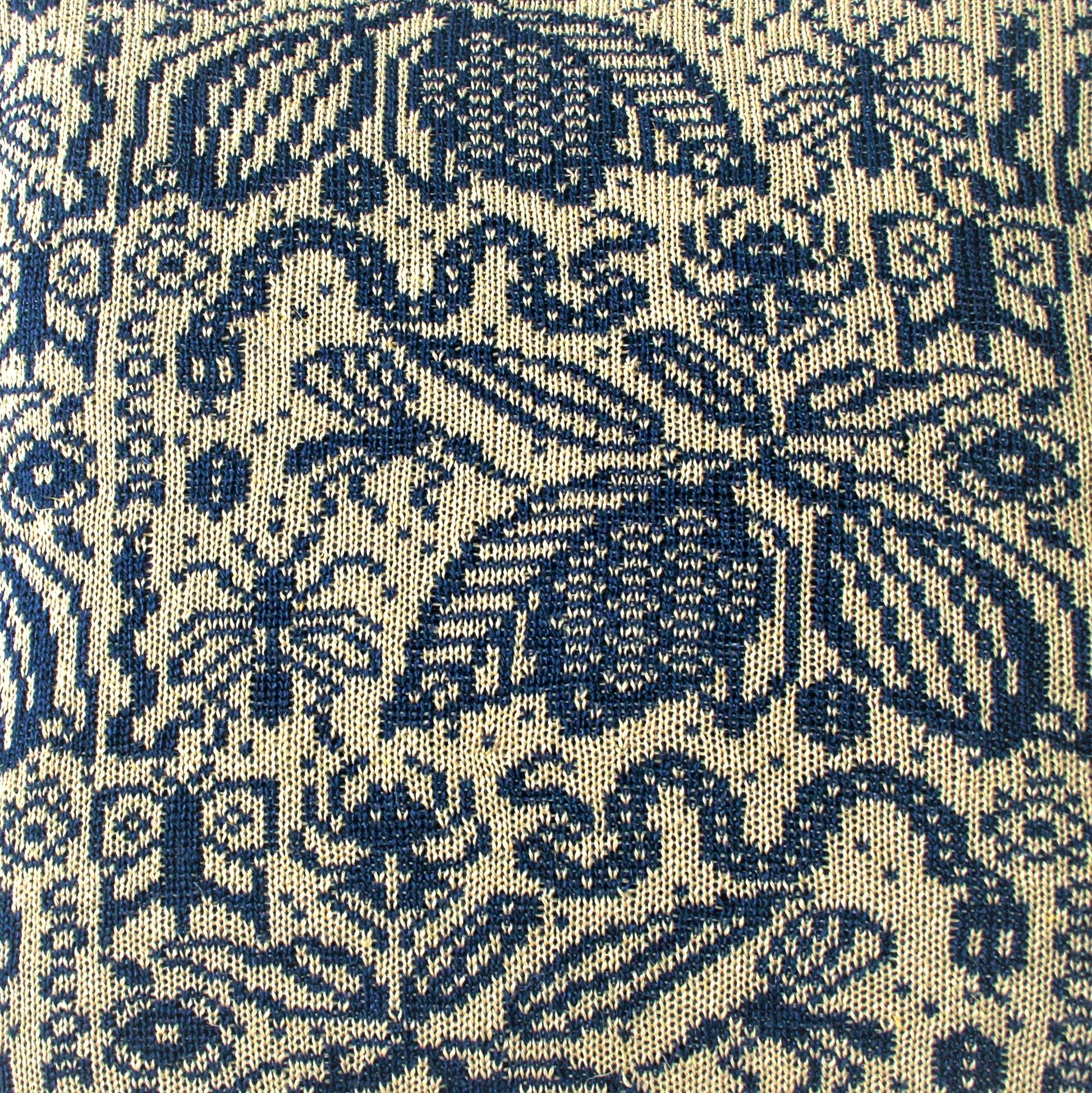Kuddfodralet är handstickat i 100% lingarn i marinblå och natur, med en baksida i 100% linnetyg. En dold dragkedja i nederkant. Storlek 50x50 cm.