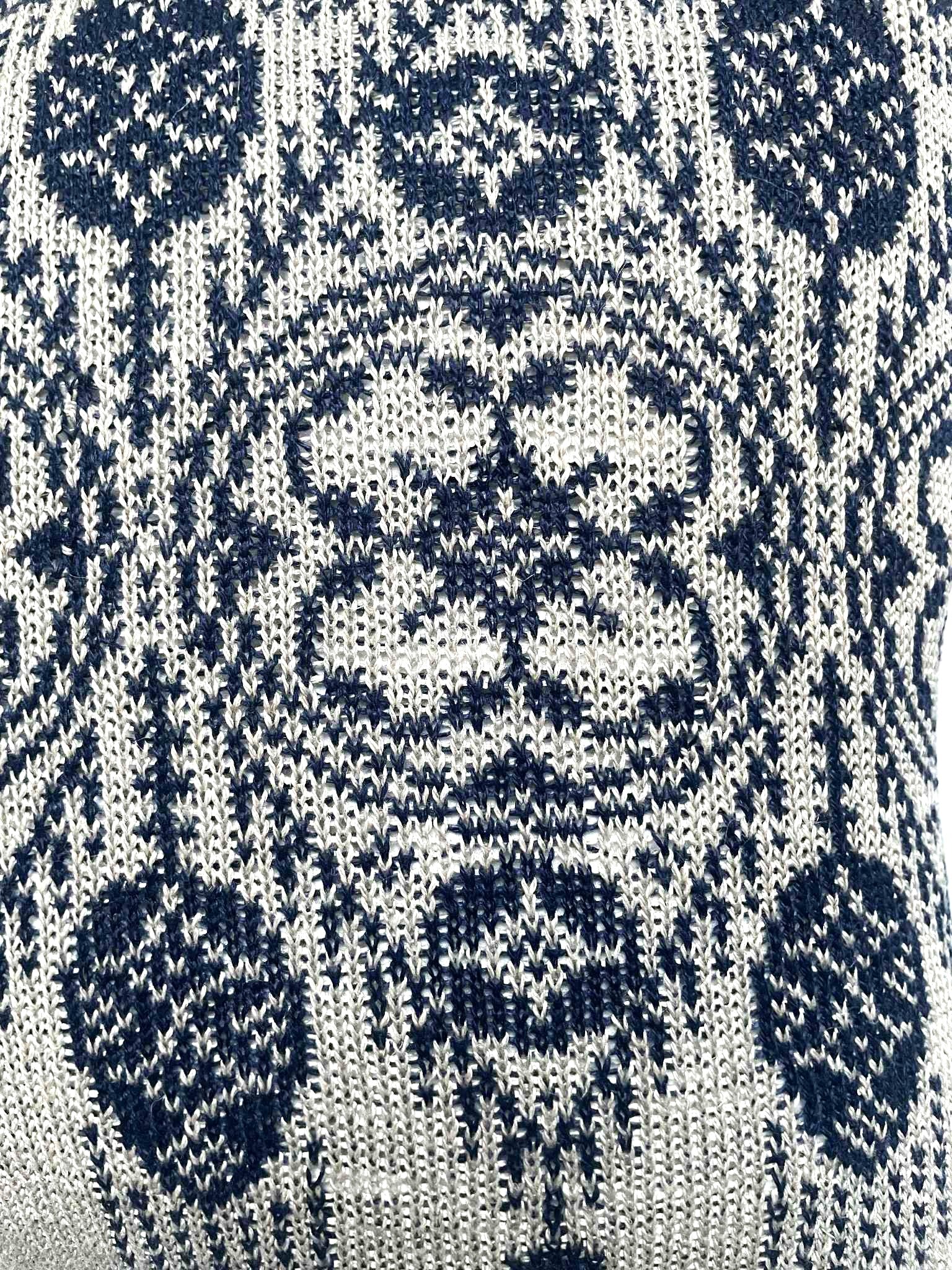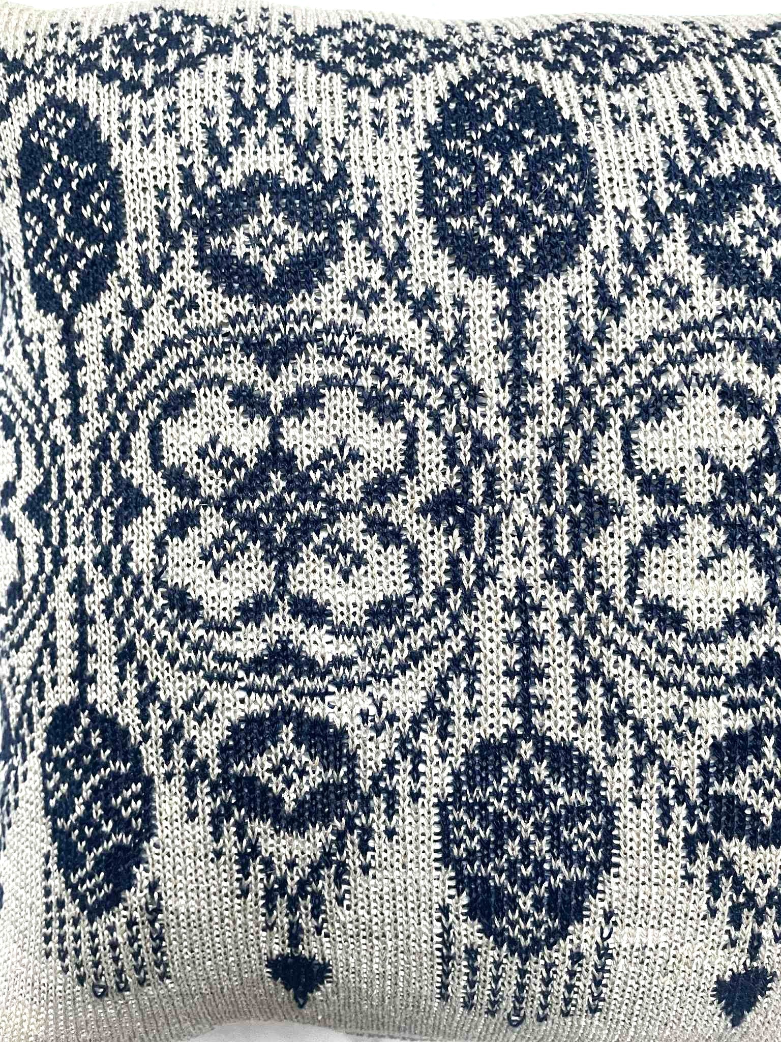 Kuddfodralet är handstickat i 100% lingarn i marinblå och natur, med en baksida i 100% linnetyg. En dold dragkedja i nederkant. Passar innerkudde storlek 50x50 cm.